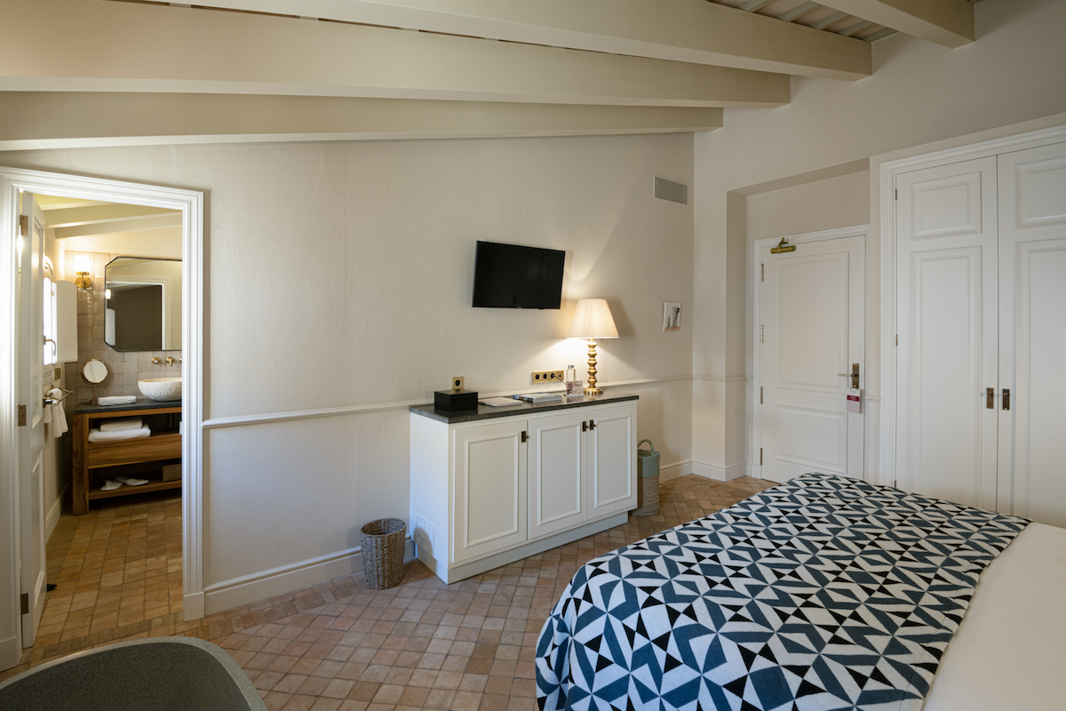 The beams have been restored and left on view, as they were originally. With a bathtub and separate bathroom and harmonious decoration, together they form an ideal room to immerse yourself in an elegant and relaxed atmosphere.